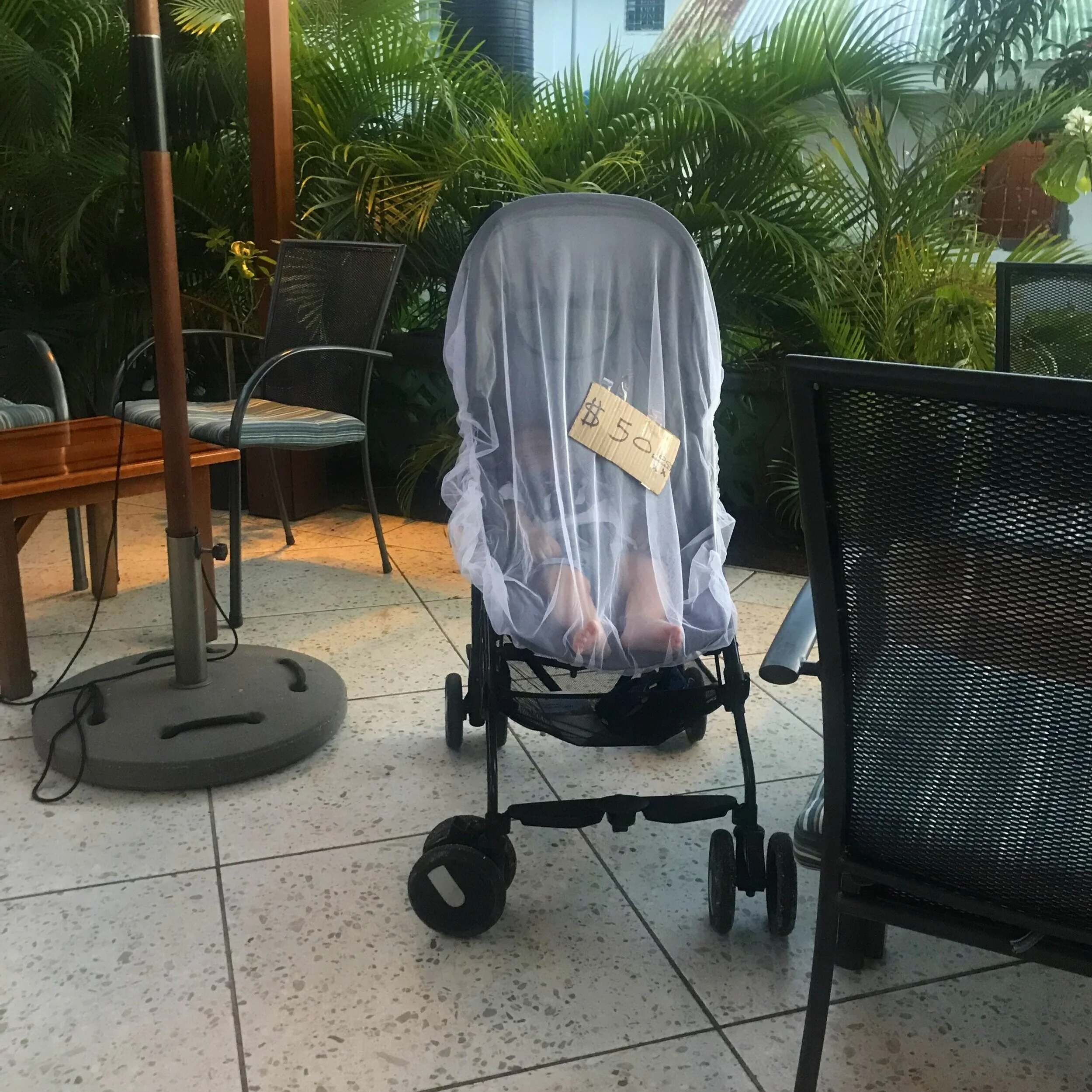 Naj se otrok s kožo ne dotika mrežice, ker ga ti mali bzzzajoči hudiči vseeno popikajo. Tale mrežica je za malo dinarčkov kupljena v DM prodajalni. Vzeli smo 2. Našega dojenčka pa na Karibih nihče ni hotel vzet oz kupit :)