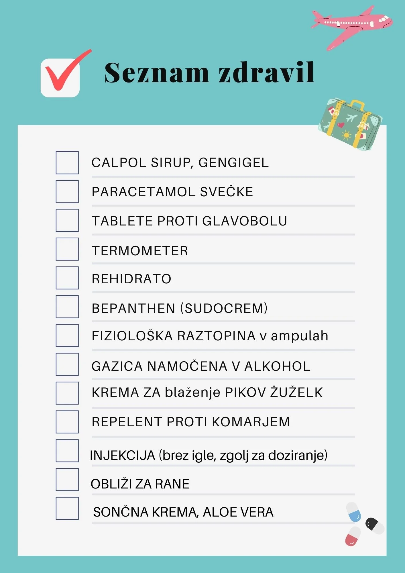 Moj seznam potovalne lekarne. Ponavljam: MOJ. To pomeni, da ga ti prilagodiš vašim potrebam in destinaciji.